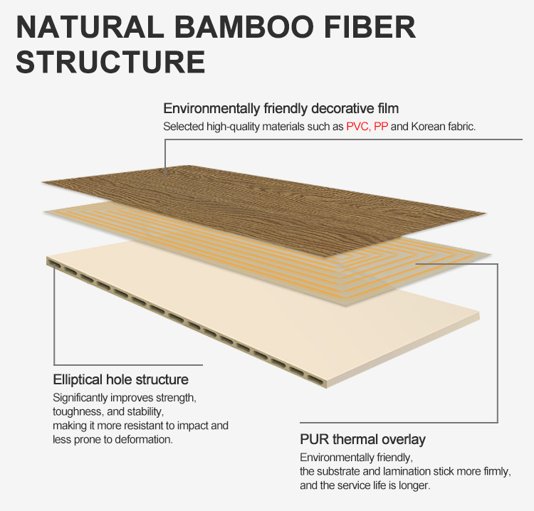 WPC composite board has a three-layer structure, the first layer is base material layer, the materials included in this layer are high densify bamboo and wood. The second layer is composite layer, the materials included in this layer is PUR hot melt adhesive, and the third layer is finishing layer, the materials included in this layer is PP film, EPL film, or Leather & VEL/VET or Skin feeling